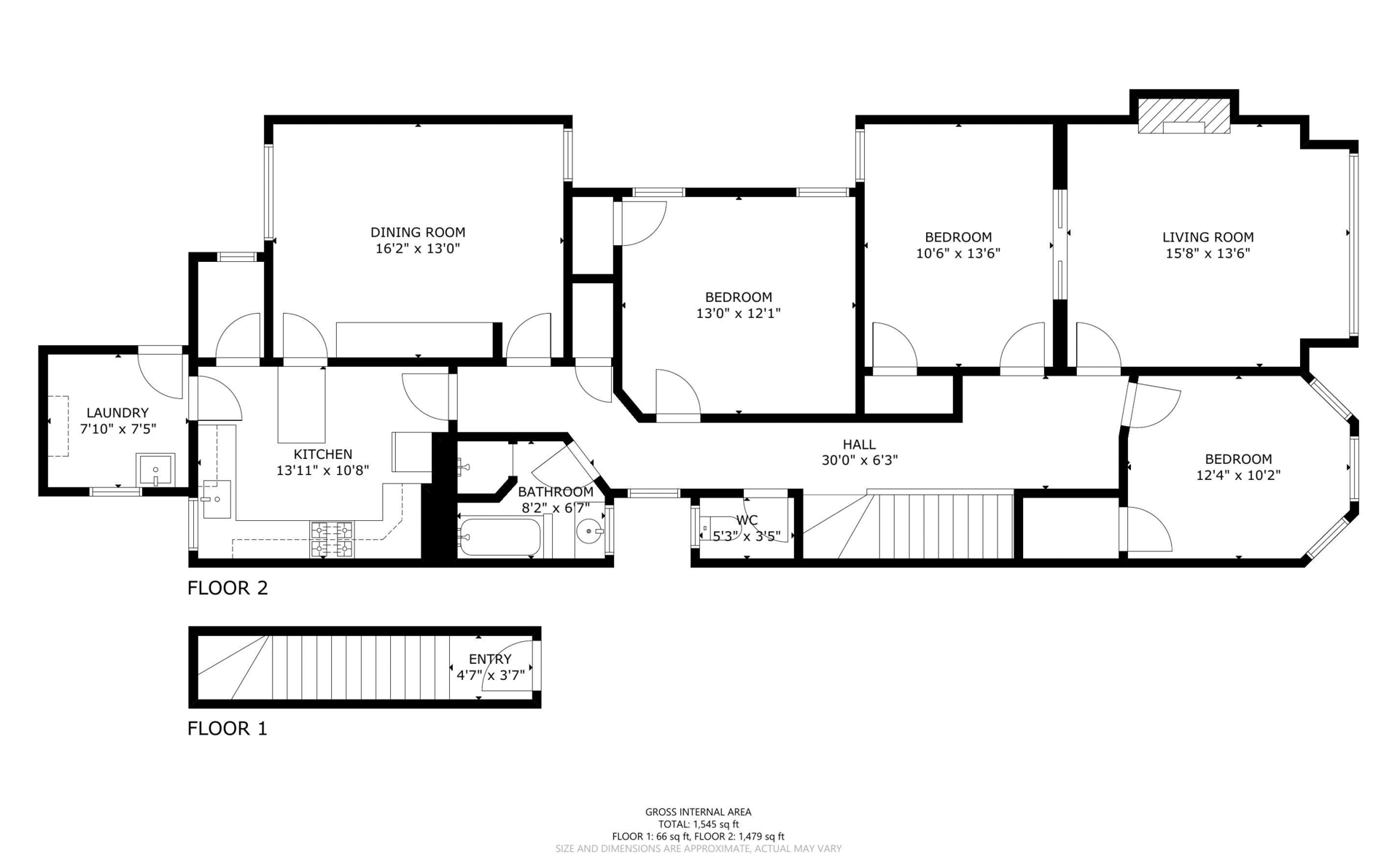 - Three bedroom, one bathroom layout (per graphic artist)